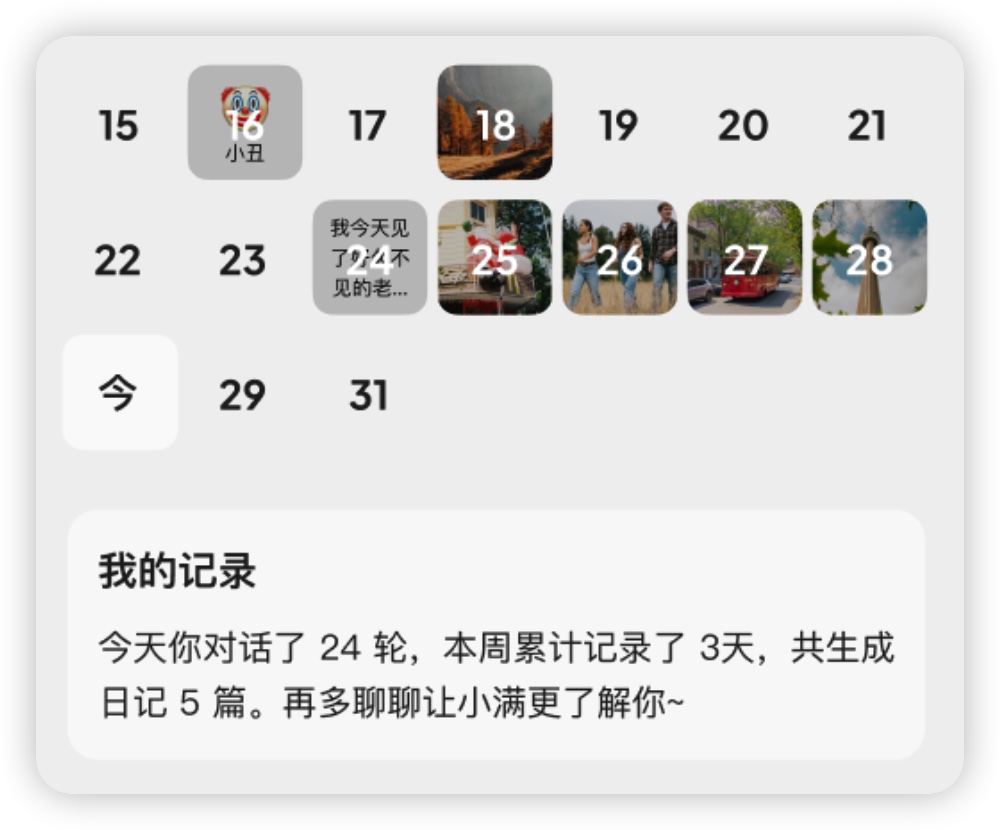 你可以像发给老友发消息一样,聊聊当下的心情、发生的事,甚至只是随手拍一张照片,小满会帮你记下这些瞬间